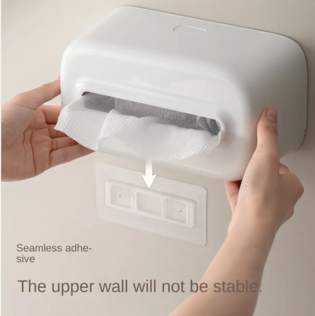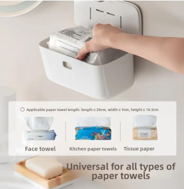 modern plastic wall mounted storage box for towels and tissues with inverted paper roll shelf suitable for kitchen and bathroom use